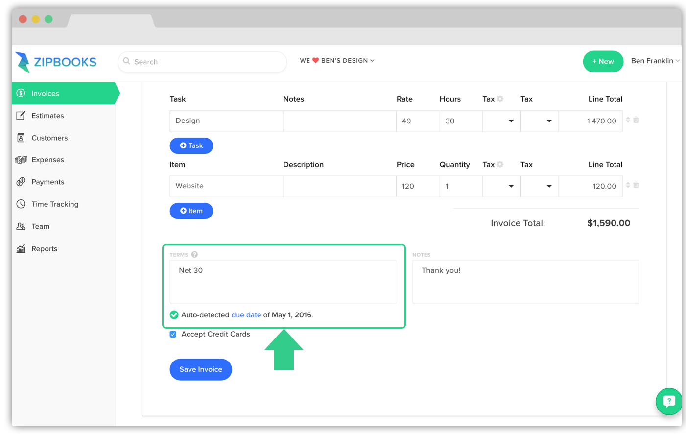 ZipBooks uses what we call magic due dates to auto-detect a due date based an invoice’s terms. Magic due dates are assigned when you write either “Net (#)” or “Due (date)” in the Terms section of an invoice. For example, write “Net 30” or “Due April 12, 2016,” and ZipBooks will automatically figure out when […]
